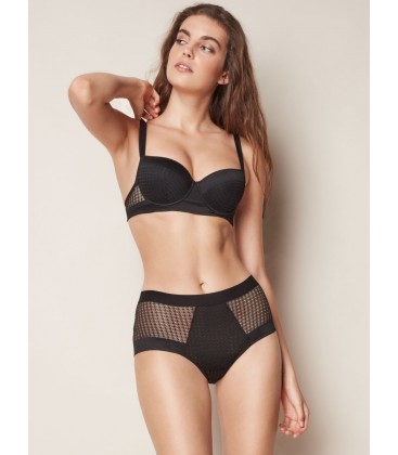 Sujetador capacidad con aro y foam en tejido de encaje geométrico. Acabado bajo en goma elástica. Braguita alta en tejido de encaje geométrico con acabados en goma elástica.