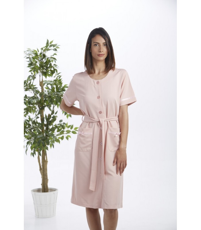 Bata mujer de pique finita ,con cuello redondo ,manga corta cierre de botones y cinturón delantero ,bolsillos de plastón.