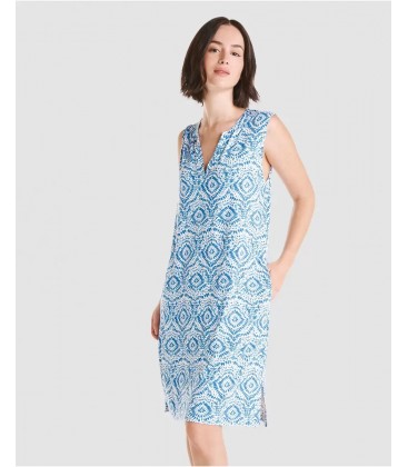Vestido corto de mujer LOHE, sin mangas, confeccionado en punto de viscosa estampada. Diseño con cuello pico y abertura frontal, bolsillos laterales y tambien aberturas en los laterales. Una prenda versátil, cómoda y atractiva, ideal para el día a día con un toque de estilo.