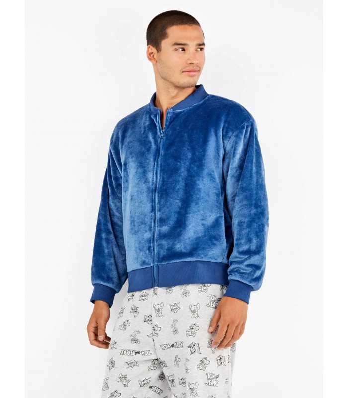 Chaqueta corta bomber azul de peluche marca Gisela, con puños elásticos y detalle de rib en el cuello que aporta un toque moderno. Cuenta con prácticos bolsillos laterales y cierre de cremallera frontal. Suave, cálida y con estilo, ideal para combinar con looks cómodos y casuales.