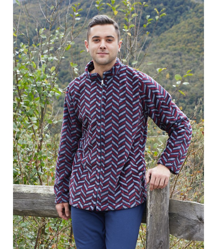 Bata corta de hombre confeccionada en cálido tejido polar con estampado moderno. Presenta bolsillos laterales y práctico cierre de cremallera. Su tacto es excepcionalmente suave, ideal para el descanso y los días fríos. Marca Cue, sinónimo de confort y estilo casual en el hogar.