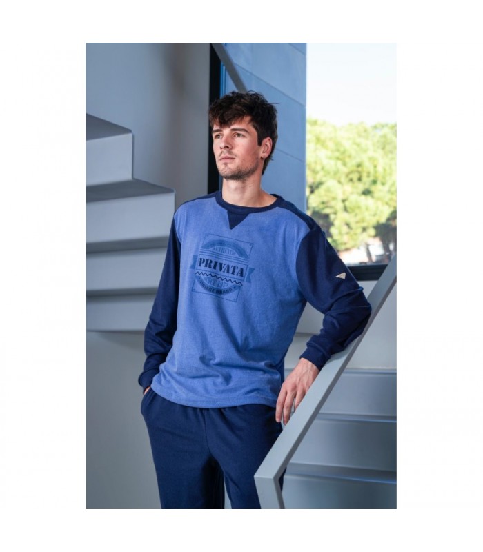 Pijama para hombre manga larga marca Privata De tacto suave. Camiseta en color azul con logo de la marca, y mangas en azul oscuro. Pantalón a conjunto en color azul marino, con bolsillos, cintura ajustable. Cómodo y moderno, ideal para casa.