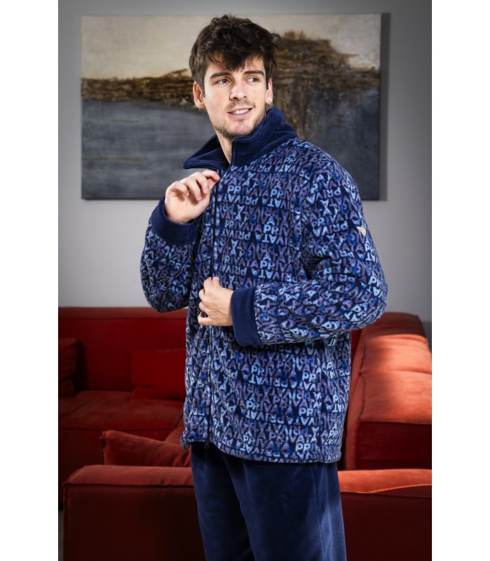 Bata corta de hombre confeccionada en cálido tejido polar con estampado moderno. Presenta bolsillos laterales y práctico cierre de cremallera. Su tacto es excepcionalmente suave, ideal para el descanso y los días fríos. Marca PRIVATA sinónimo de confort y estilo casual en el hogar.