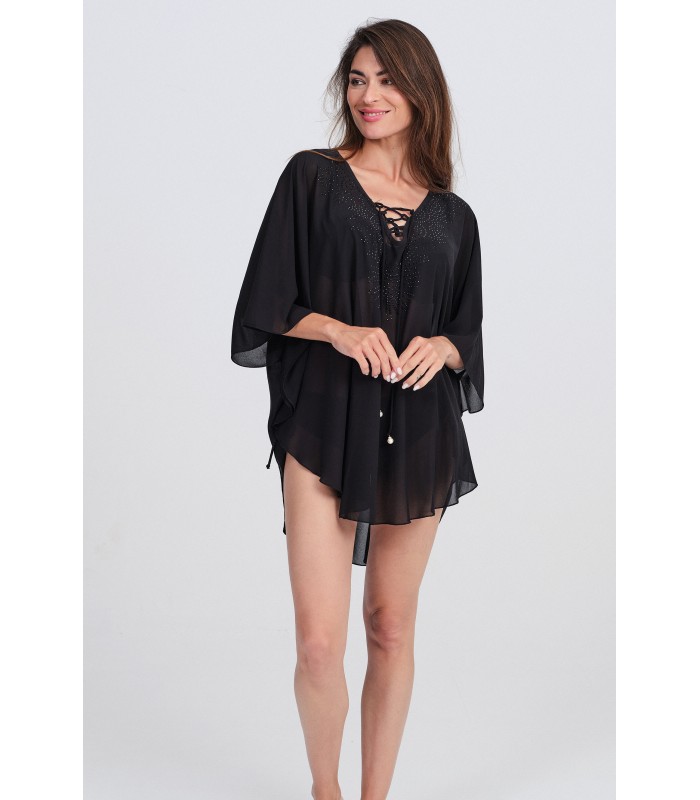 Caftán playero corto para mujer de Rasdemar, de estilo amplio y sin mangas. Confeccionado en tul ligero, presenta cuello de pico y detalles brillantes en el pecho que aportan un toque bohemio y original. Fresco, cómodo y ligero, ideal para lucir con estilo en los días de verano.