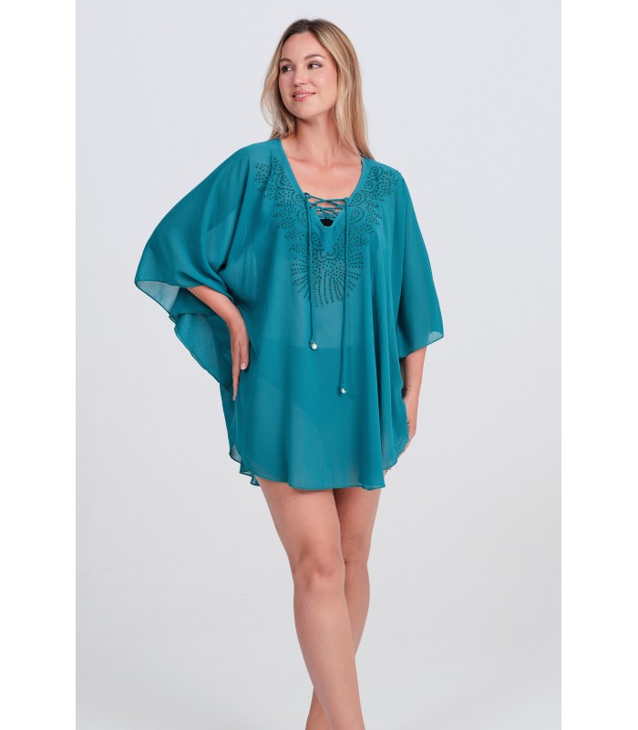 Caftán playero corto para mujer de Rasdemar, de estilo amplio y sin mangas. Confeccionado en tul ligero, presenta cuello de pico y detalles brillantes en el pecho que aportan un toque bohemio y original. Fresco, cómodo y ligero, ideal para lucir con estilo en los días de verano.