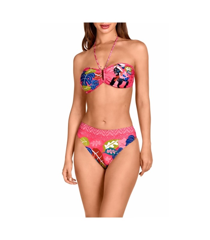 Bikini bandeau de capacidad de Dolores Cortés, diseñado para ofrecer máxima sujeción y cobertura. Incorpora copas balconette preformadas con aros y sin foam, que moldean el pecho de forma natural, con un ligero drapeado hacia el escote y un elegante abalorio decorativo. Especialmente pensado para copa E, garantiza un ajuste cómodo y seguro durante todo el día. Dispone de tirantes al cuello opcionales que aportan versatilidad. La braga midi, totalmente forrada, asegura mayor confort y adaptación. Los bordes ribeteados en las copas ofrecen un acabado cuidado, mientras que el forro al tono refuerza la calidad. Ideal para lucir con estilo y confianza.
