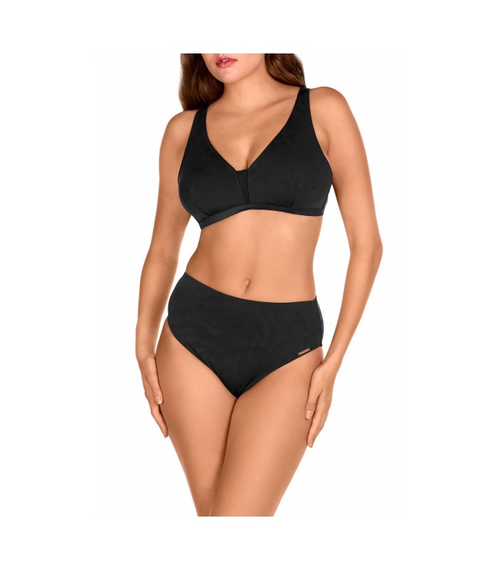 Bikini copa D sin aros de Dolores Cortés con relleno extraíble para mayor comodidad. Tirantes regulables que aseguran un ajuste perfecto. Braga de talle alto que estiliza la silueta. Forro en color negro para un acabado elegante y mayor seguridad. Ideal para lucir cómoda y con estilo.