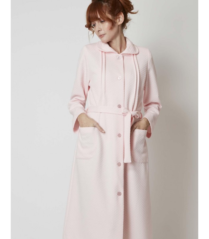 Bata mujer de pique finita, con cuello bebé, manga larga cierre de botones y cinturón delantero, bolsillos de plastón y detalle de jaretas a tono en el pecho.